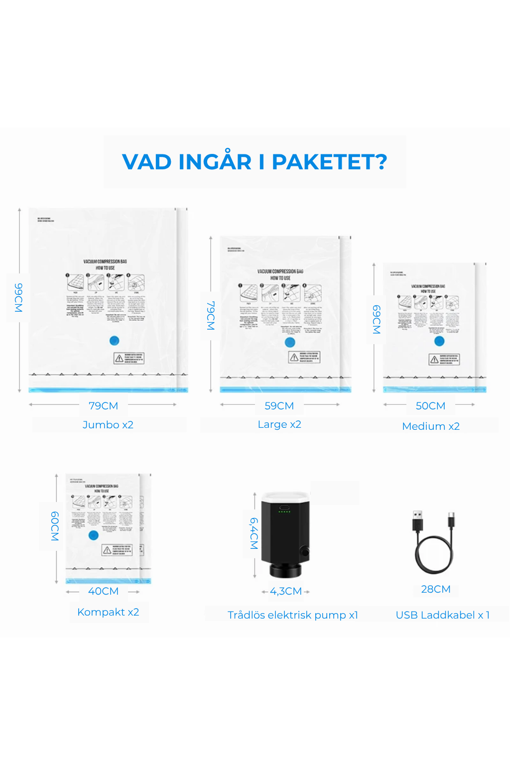 Oavsett om det är ett duntäcke eller några tröjor så finns en storlek på påse för just ditt behov. Pumpen kommer komplett med laddkabel och 8st påsar i 4 olika storlekar. Allt för att passa just ditt behov!